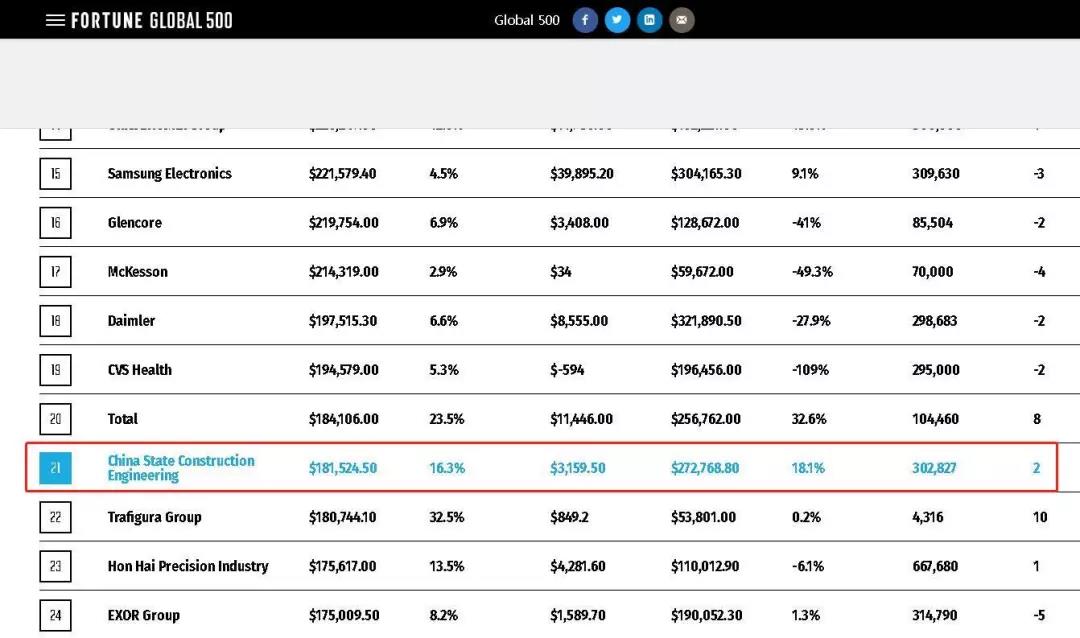 In 2018, the company’s revenue reached US$181.524 billion and continued to be the world’s largest construction company. The company has been on the list for 14 years since 2006 and climbed steadily during that period. Its standings by year were: 486th (2006), 396th (2007), 385th (2008), 292nd (2009), 187th (2010), 147th (2011), 100th (2012), 80th (2013), 52nd (2014), 37th (2015), 27th (2016), 24th (2017), 23rd (2018), and 21st (2019).